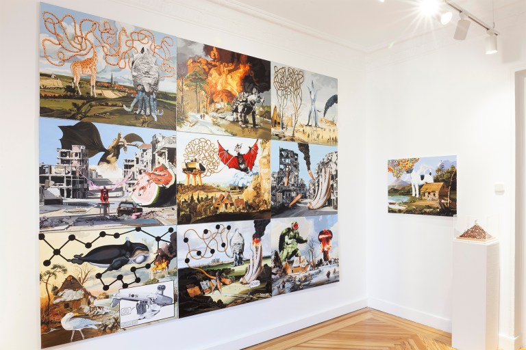 In #weareallgoingtodie, Óscar Seco embraces irony, pop culture, and cognitive estrangement to construct a visual world where baroque painting, movie monsters, comic heroes, and historical imagery collide without hierarchy. Through appropriation and playful recombination, his works blur fiction and critique, inviting viewers into a chaotic yet deliberate mosaic of references. With subversive wit and a dynamic, electric language, Seco reclaims the painted surface as a space for imaginative resistance—one that defies monotony in an age of image overload.