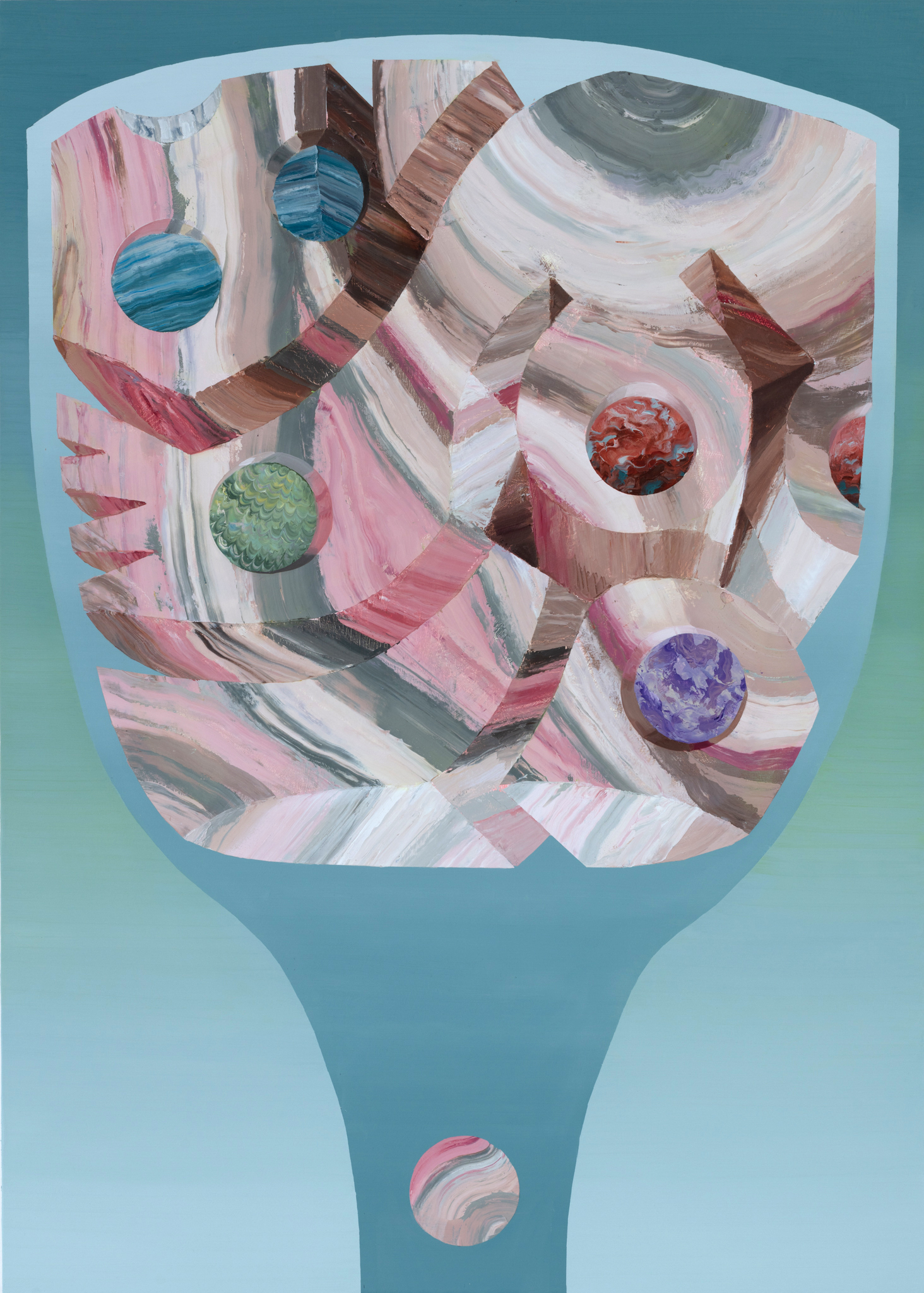 Despite the trajectory of revising the mythology of mankind, Quiroz’s Ometéotl is not of human form. Adding to the layers of symbolism in his work, he paints the separation of Ometecuhtli and Omecihautl as two goblets, symbolizing blossoming flowers, birth and are present in Pre-Hispanic and Catholic sacred rituals. Quiroz’s impeccable goblets offer innards made from pre-Hispanic carvings of fleshy rock that could be the body of Christ—flesh that would be eaten from the chalice that traditionally contains red wine as the symbol of his blood. The artist has inscribed circular inserts onto these fleshy offerings that could be planets, unifying the intangible universe with the tactility of flesh and filling the goblets with other (possible) worlds. We are far from stuck: we are invited to eat and drink from Haraway’s “thick, ongoing presence.”